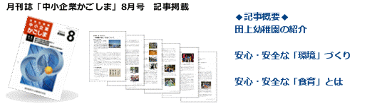 鹿児島県中小企業団体中央会の月刊誌「中小企業かごしま」の連載記事「安心・安全を守る」に、「幼稚園の安心安全について」という内容で掲載されました。 ![]() ▼ダウンロード 「中小企業かごしま8月号」掲載記事( |